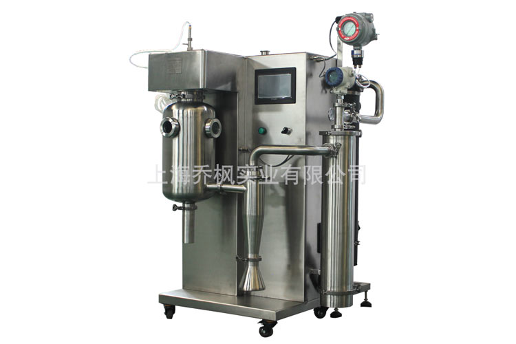 實驗型閉式噴霧干燥機采用菜單式微處理控制器,可以直接設置進口溫度、氣流量、自動通針頻率、蠕動泵速,實現數據采集以及過程監控和控制。自吸蠕動泵將樣品液體從容器中通過噴嘴進入干燥腔,同時壓縮空氣從外層套管進入干燥腔使液體微粒化,熱空氣從上層進入與噴霧后的液體微粒相遇,物品開始干燥,干燥后的粉粒通過旋風分離器與廢氣分離后進入收集瓶中,廢氣則通過直徑軟管直接排到大氣或空氣過濾裝置。實驗型閉式噴霧干燥機主要適用于高校、研究所和食品醫藥化工企業實驗室生產微量顆粒粉末,對所有溶液如乳濁液、懸浮液具有廣譜適用性,實驗型閉式噴霧干燥機適用于對熱敏感性物的干燥如生物制品、生物農藥、酶制劑等,因所噴出的物料只是在噴成霧狀大小顆粒時才受到高溫,故只是瞬間受熱,能保持這些活性材料在干燥后仍維持其活性成份不受破壞。