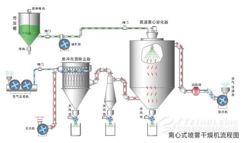 經(jīng)過過濾和加熱后,空氣進入干燥機頂部的空氣分配器,熱空氣以螺旋狀均勻進入干燥室。 物料液體通過塔身頂部的高速離心霧化器或高壓霧化器噴入非常細的霧狀液珠中,并且可以在很短的接觸時間內(nèi)干燥成成品 與空氣平行。 成品從干燥塔和旋風分離器的底部連續(xù)輸出,細粉塵通過脈沖袋式集塵器收集,廢氣通過風扇排出。